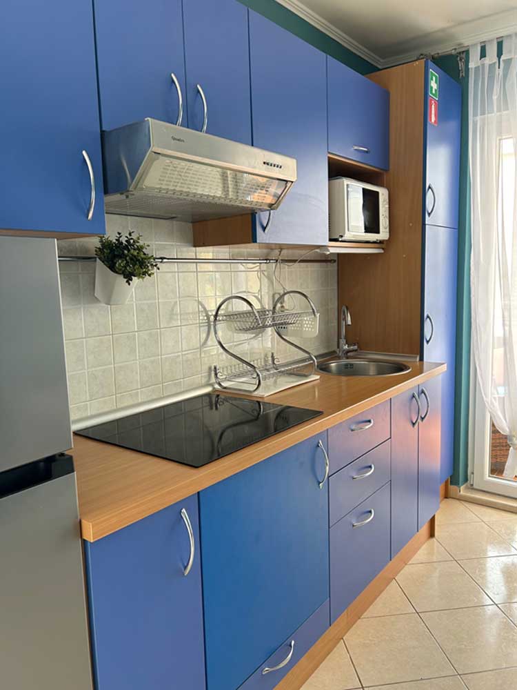 A konyha teljesen felszerelt: Hűtőszekrény fagyasztóval, mikró, elektromos 4-es főzőlap, vízforraló, kávéfőző, kenyérpirító, edénykészlet, -tányér, -evőeszköz.-pohárkészlet és még sok konyhai felszerelés biztosítja a lehetőséget a főzésre. Az hangulatos étkezőben 5 fő kényelmesen helyet tud foglalni, ahol a halpiacon megvett és az apartmanban megsütött halat egy dalmát bor kíséretében vidám hangulatban tudnak elfogyasztani. A kisgyermekek számára kiságyat és etetőszéket biztosítunk.