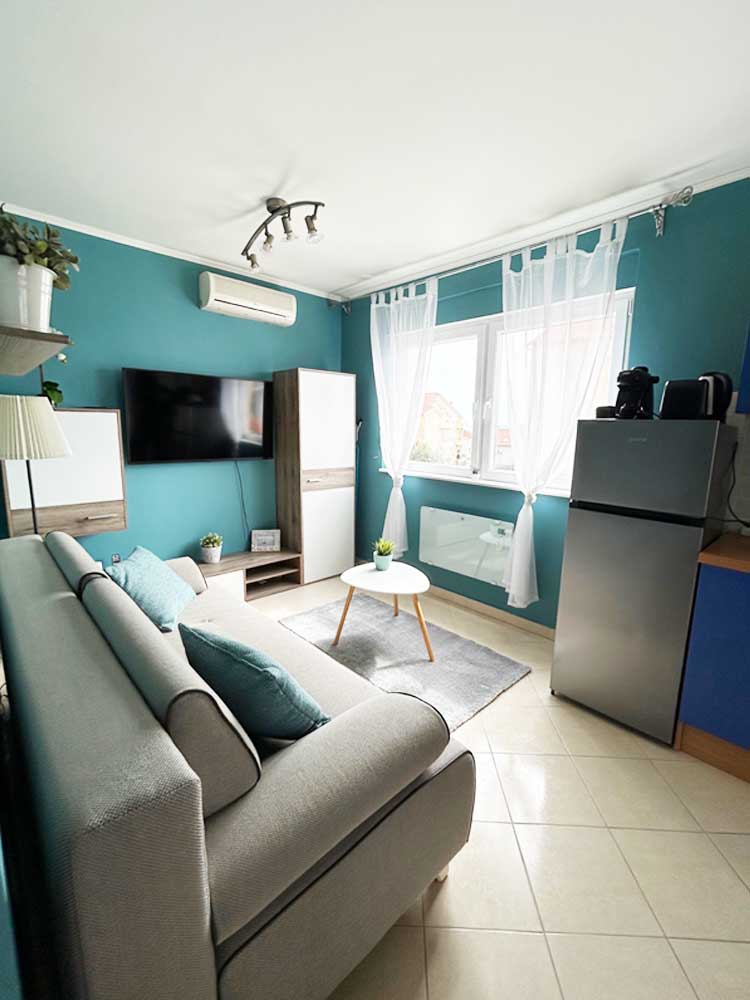 2+2 főt és egy kisgyermeket tudunk elszállásolni. A víz sekély, aprókavicsos, homokos, kisgyermekes családoknak ideális. Apartmanunk egy apartmanház magas földszintjén található , egy szoba,nappali modern